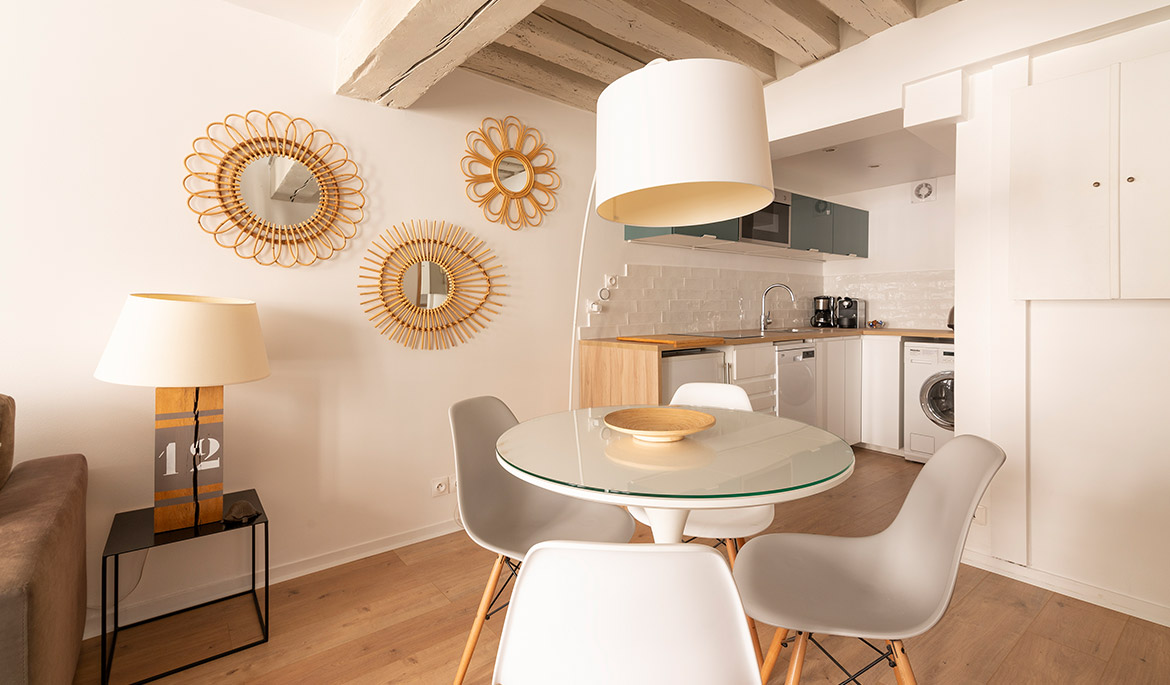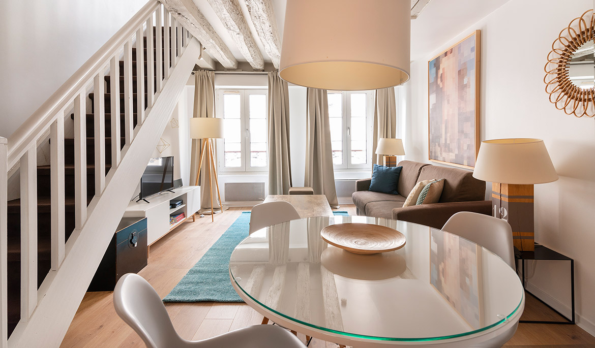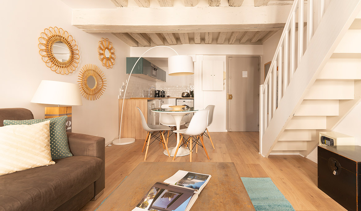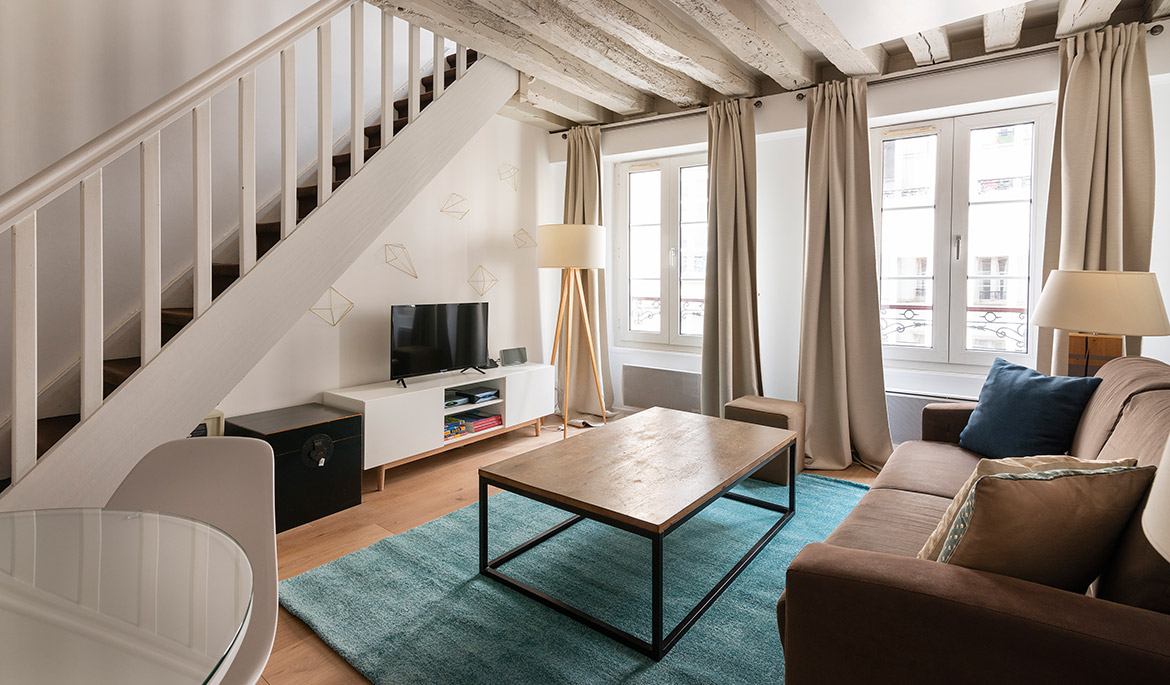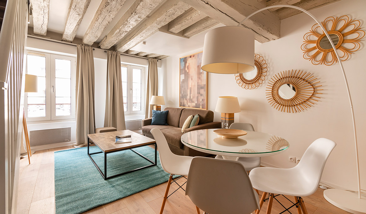 Located on a charming side street of the historic Marais neighborhood, the Marais Delight apartment combines the classic Parisian charm of exposed beam architecture with the comfort and style of modern furnishings and amenities. This is the ideal location to explore the best areas of central Paris by foot.
