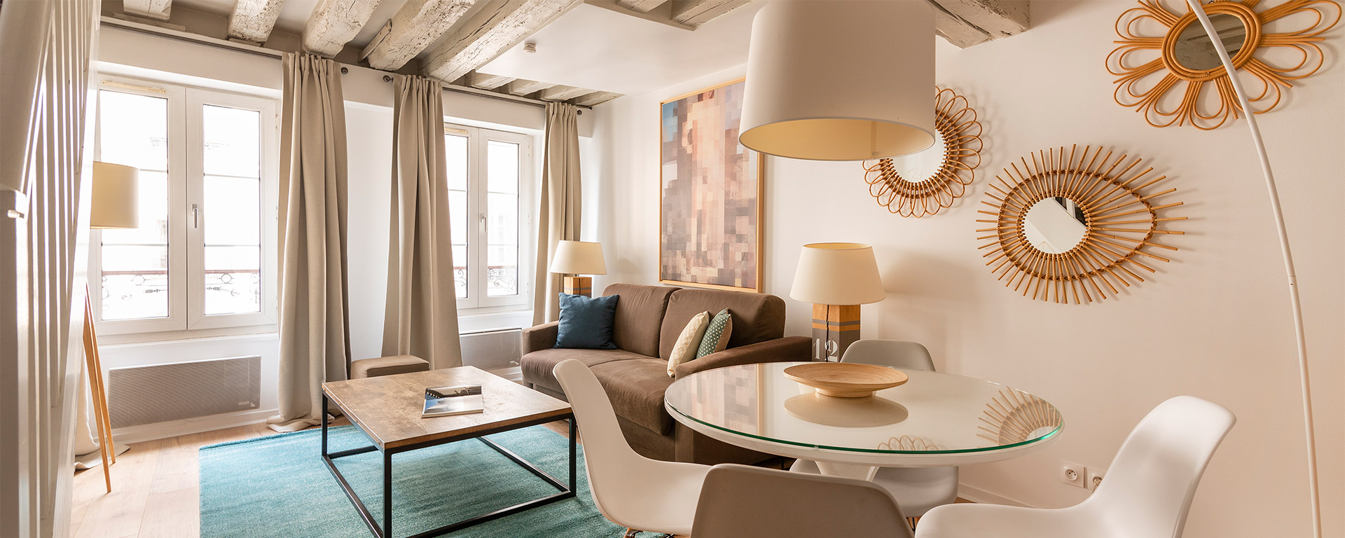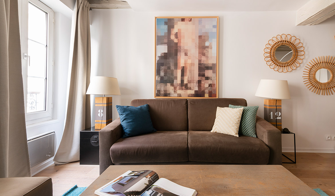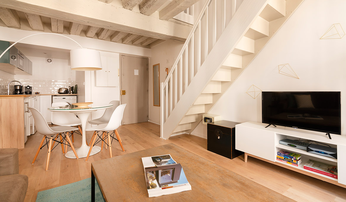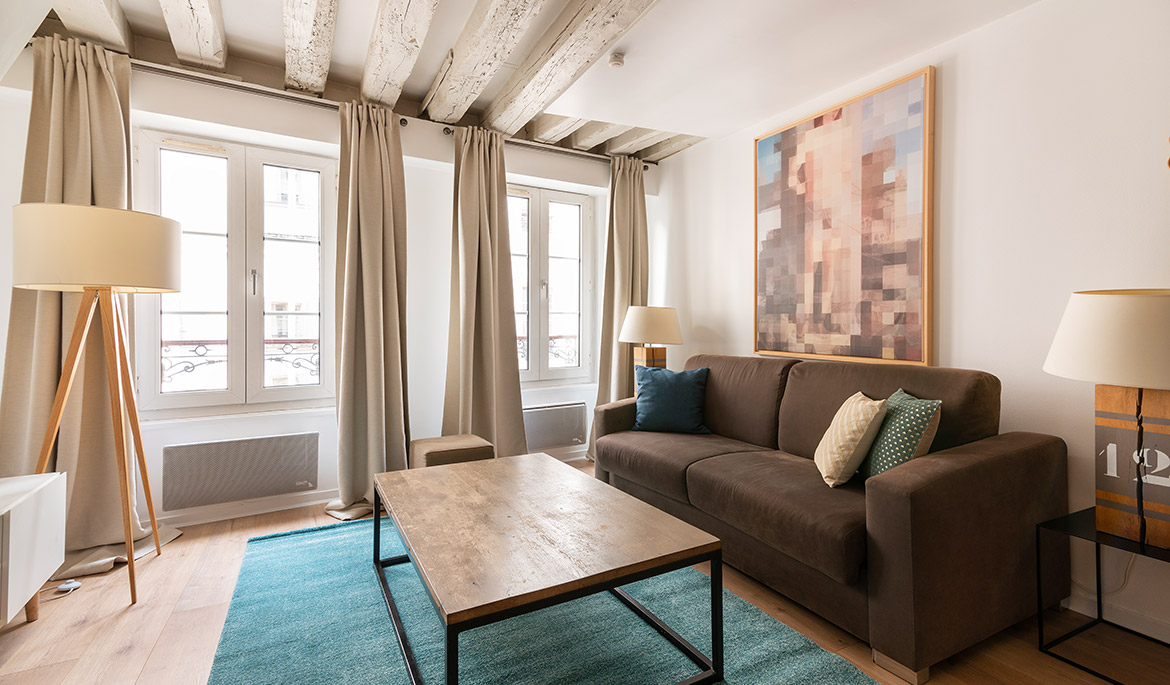 Located on a charming side street of the historic Marais neighborhood, the Marais Delight apartment combines the classic Parisian charm of exposed beam architecture with the comfort and style of modern furnishings and amenities. This is the ideal location to explore the best areas of central Paris by foot.