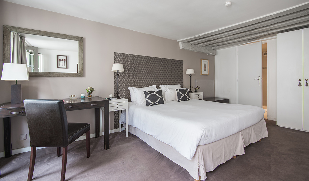 The apartment overlooks the rue du Bourg Tibourg. All windows are double glazed very efficiently. Anti bed bug mattress protector in each bed.