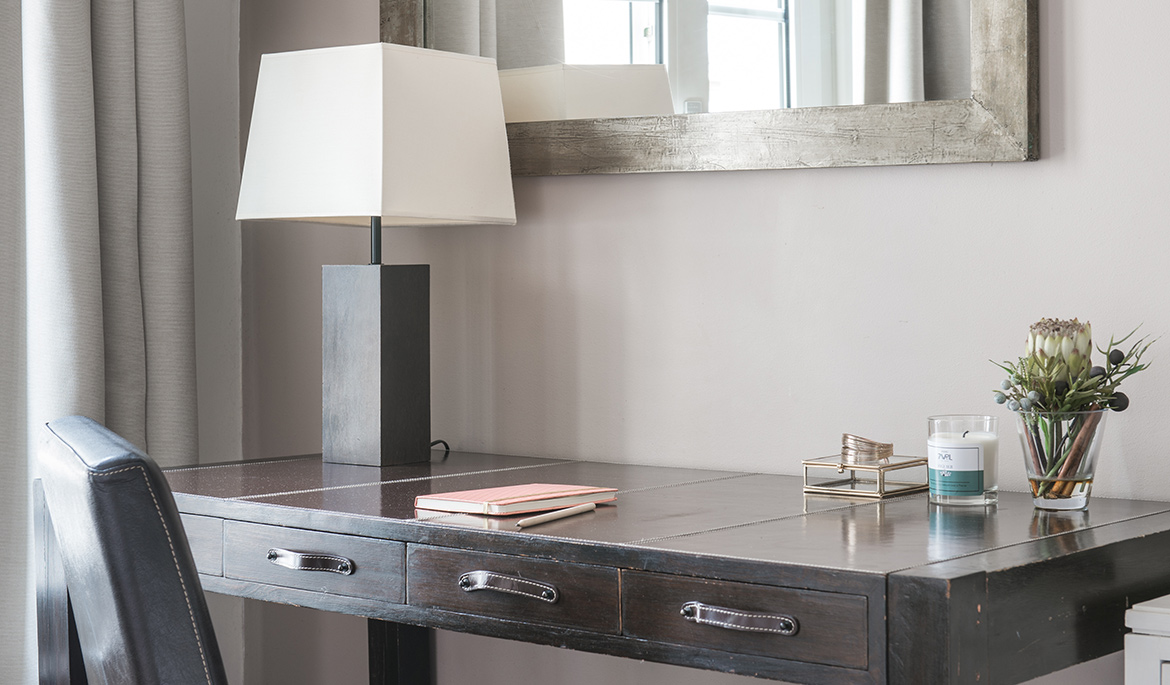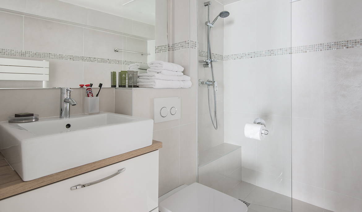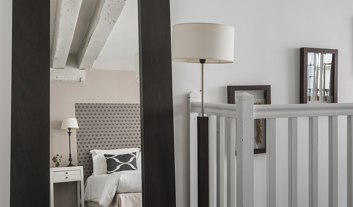 The second level is very comfy thanks to the soft carpet and the beamed ceilings. It hosts a large bedroom with king size bed, desk, and large closets. The en-suite bathroom with a toilet and italian shower is modern and stylish.
