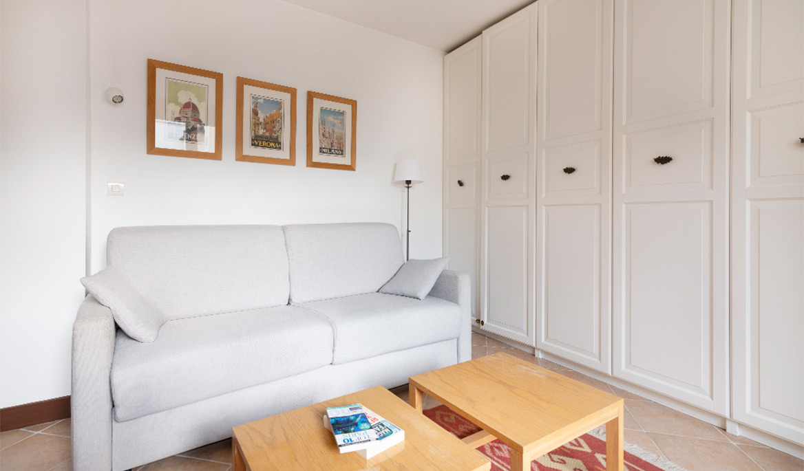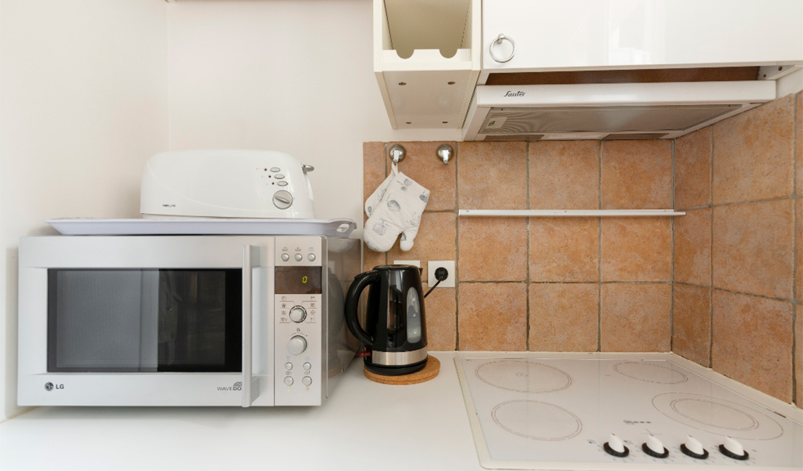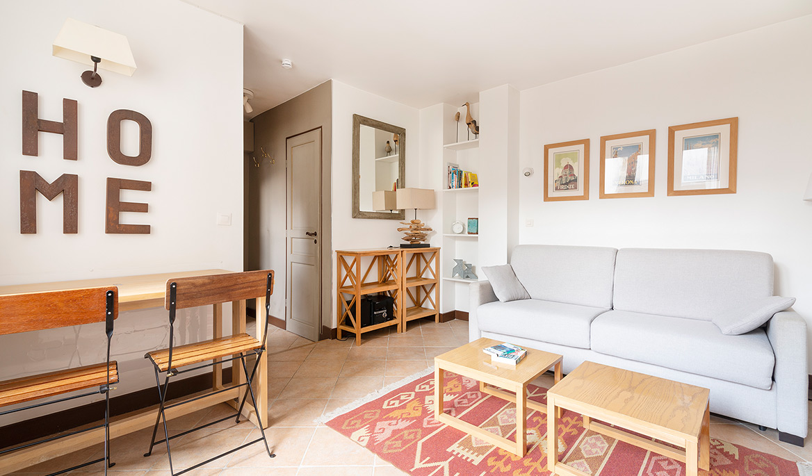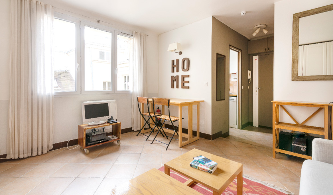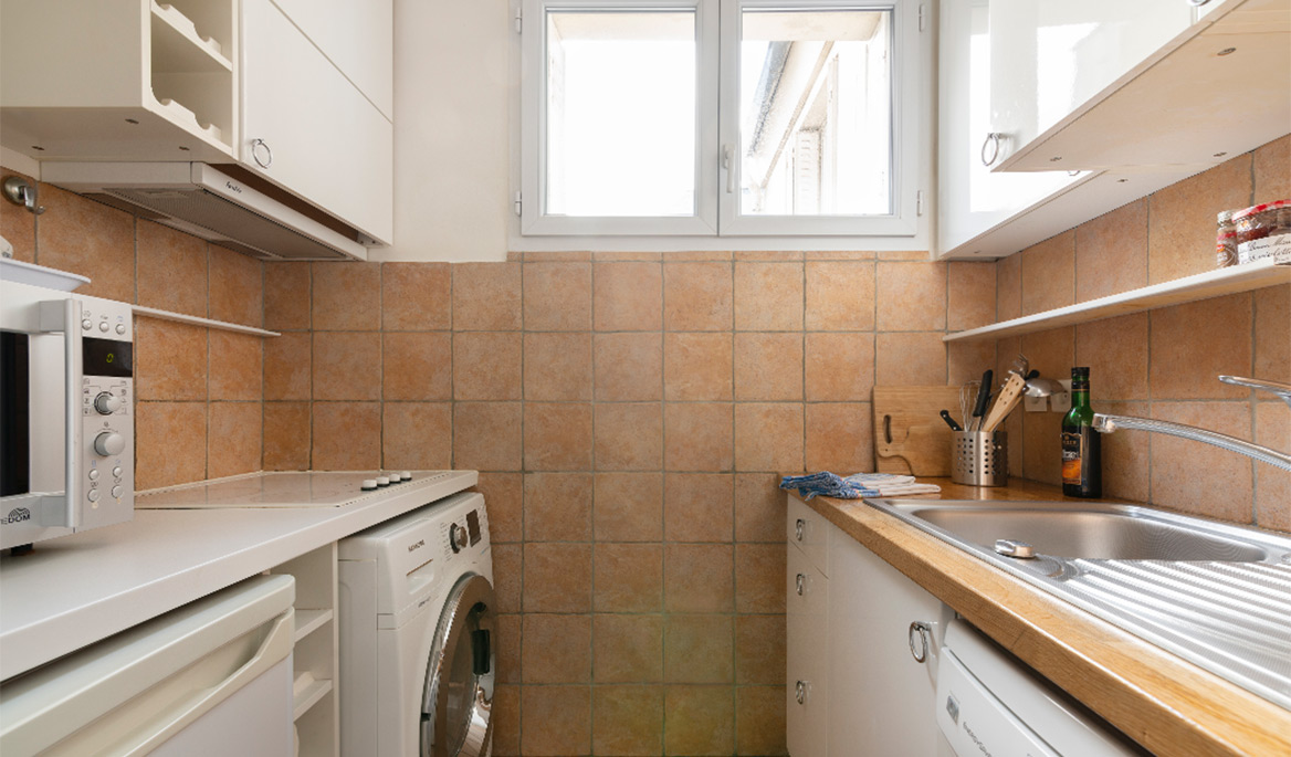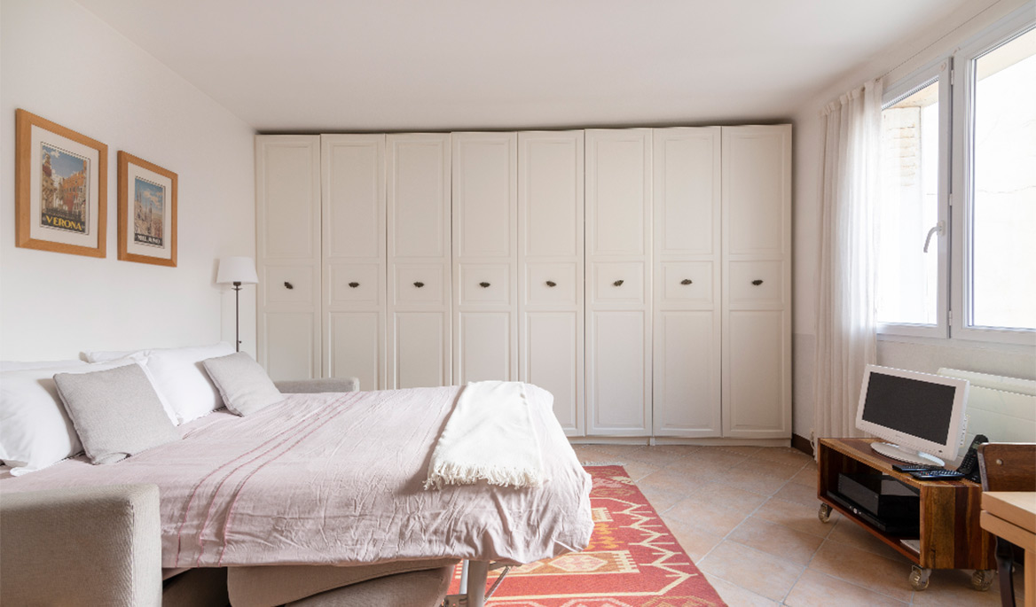 The layout of the apartment is great with no lost space. The fully equipped kitchen is separate form the living room. It has everything you need to cook and eat. The bathroom is modern and equipped with a sink, a large shower and lavatories. Facing south, the living room is bright and quiet. You can see the steeple of the Saint Paul Church from there. The comfortable sofa bed opens to a real double bed with a thick mattress. It is easy to use daily. There are several cupboards with plenty of storage space.