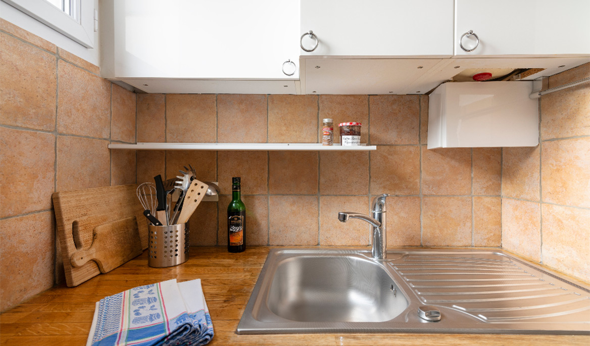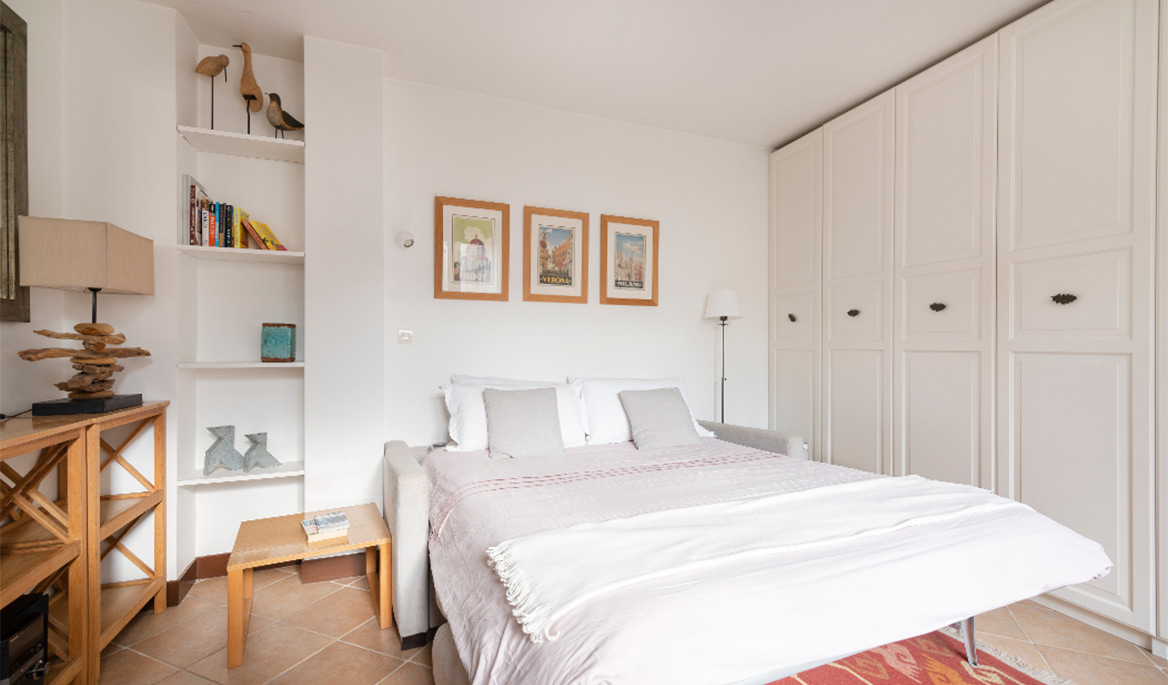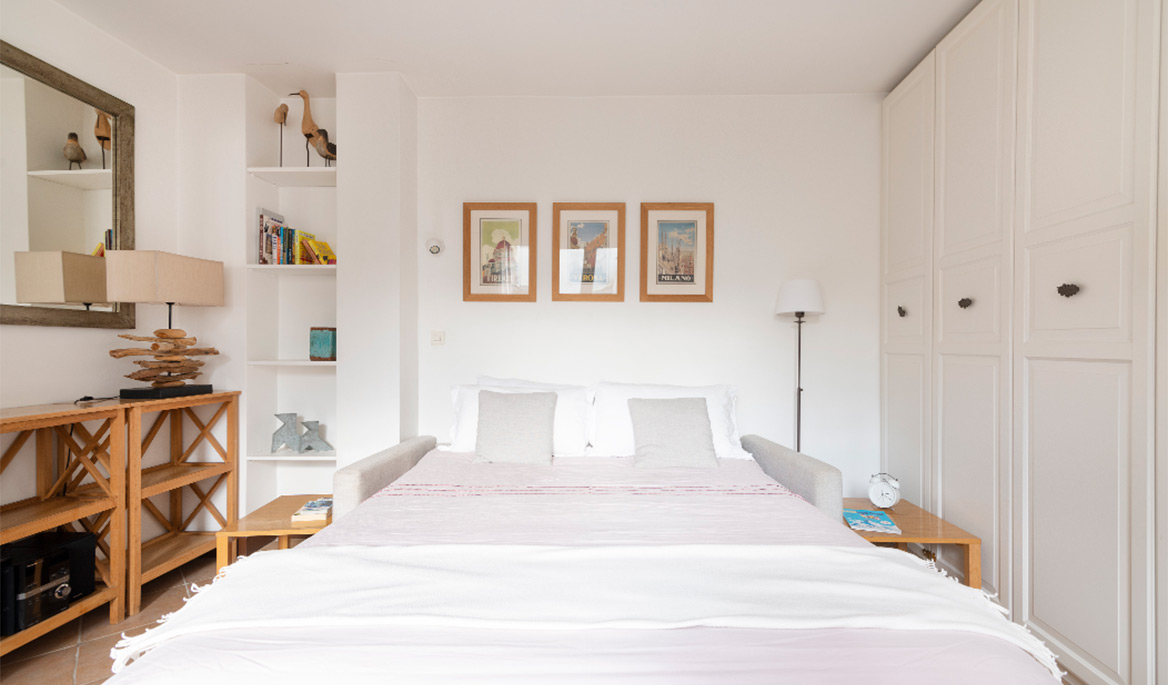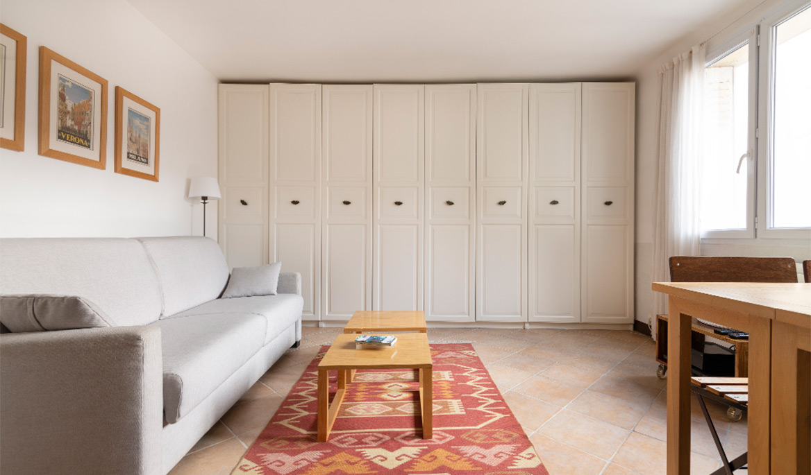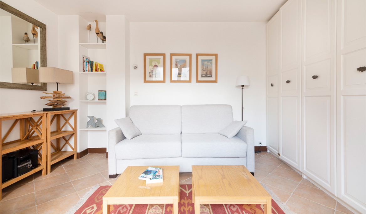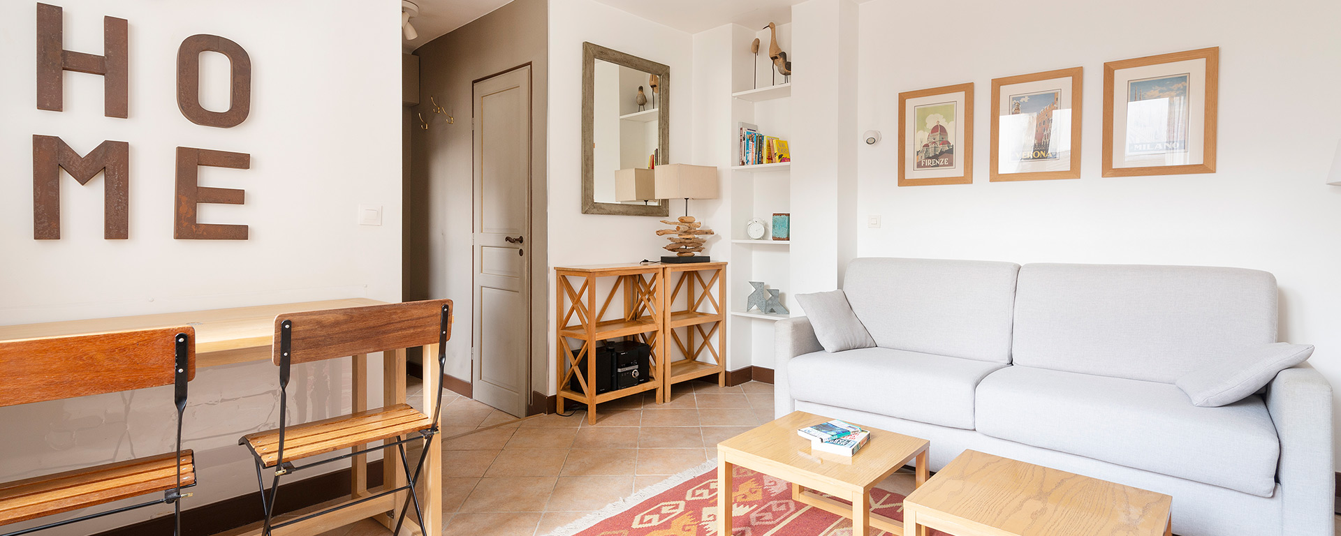 The layout of the apartment is great with no lost space. The fully equipped kitchen is separate form the living room. It has everything you need to cook and eat. The bathroom is modern and equipped with a sink, a large shower and lavatories. Facing south, the living room is bright and quiet. You can see the steeple of the Saint Paul Church from there. The comfortable sofa bed opens to a real double bed with a thick mattress. It is easy to use daily. There are several cupboards with plenty of storage space.