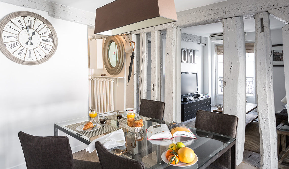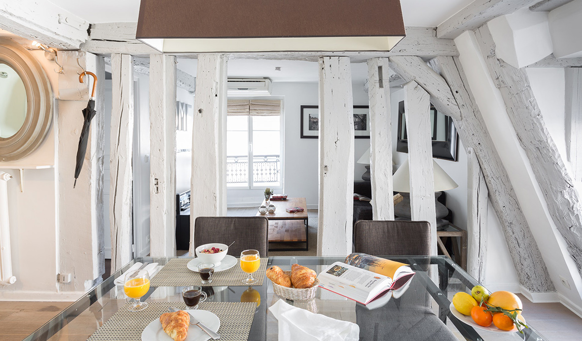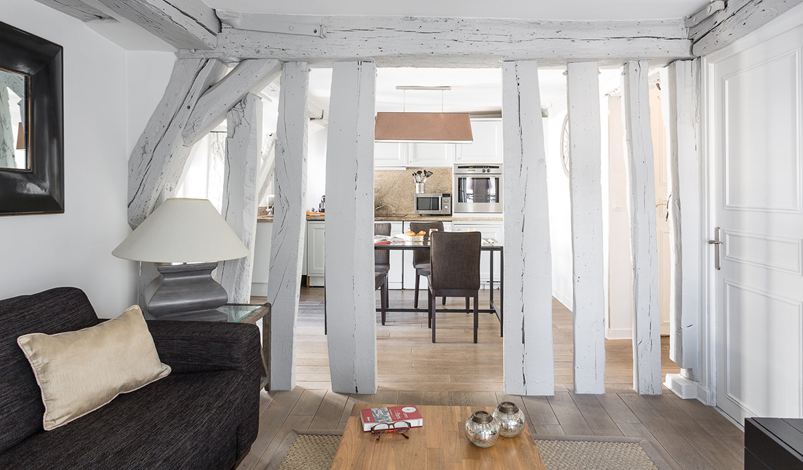 The apartment, located on the top floor of a 17th century building, is spacious with no lost space. The open kitchen is fully equipped and will allow you to cook and eat comfortably. The living room, separated by exposed beams, has a sofa bed and a large flat screen. The cozy bedroom with king size bed includes a large walk-in closet.